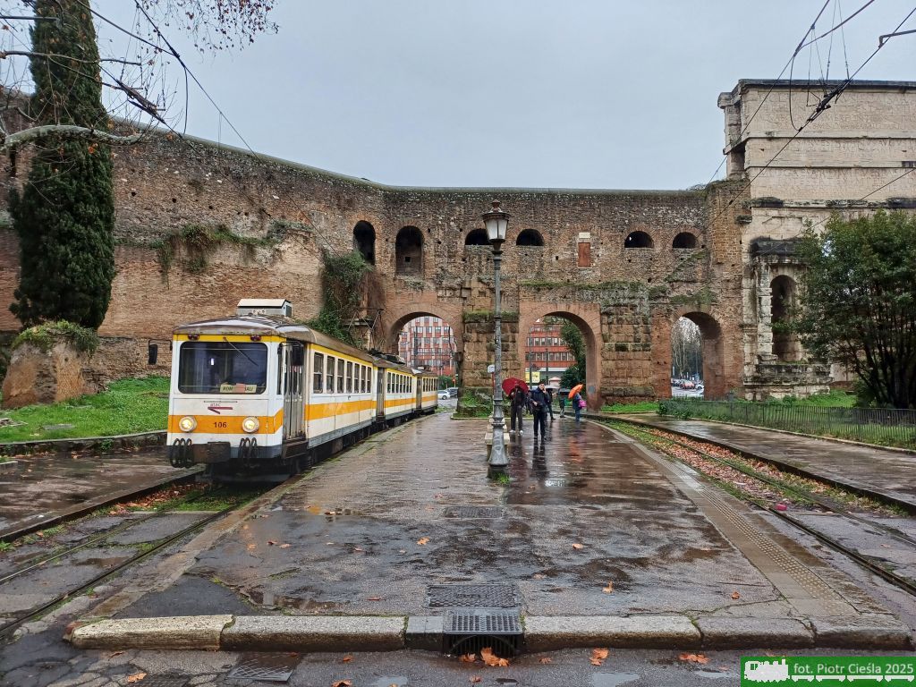 Zespół trakcyjny lekkiej kolei miejskiej Rome–Giardinetti na przystanku Porta Maggiore. W centrum Rzymu kolej Rome–Giardinetti ma cechy wysokopodłogowego tramwaju, dopiero na odcinku podmiejskim nosi cechy szybkiej kolei. Wagony Urbani Bloccati 3 to powojenna modernizacja wagonów pochodzących z okresu 20-lecia międzywojennego (Roma, Via Giovanni Giolitti, 2025.01.20) |